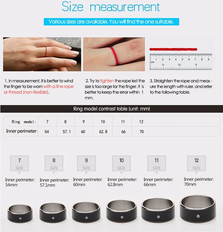 Note:Try to keep the rope more tension when measure your finger size, too big size ring will slip off easily.