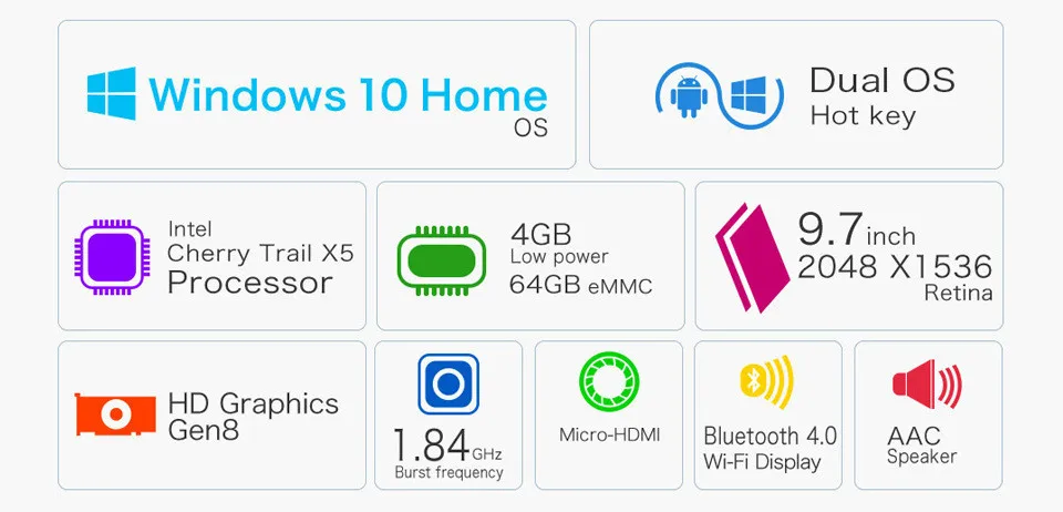 Teclast X98 Plus powered by Intel Cherry Trail X5-Z8300 chip which brings amazing performance . New coming windows 10 OS gives you a more comfortable touching experience. 12 core Gen 8 HD Graphics can give you a sense of PC class gaming experience. Besides, it has exclusive air retina display, which has amazing 2048*1536 resolution up to 264ppi exquisite display, 22% brightness improves and 45% saturation increases displays vivid color.